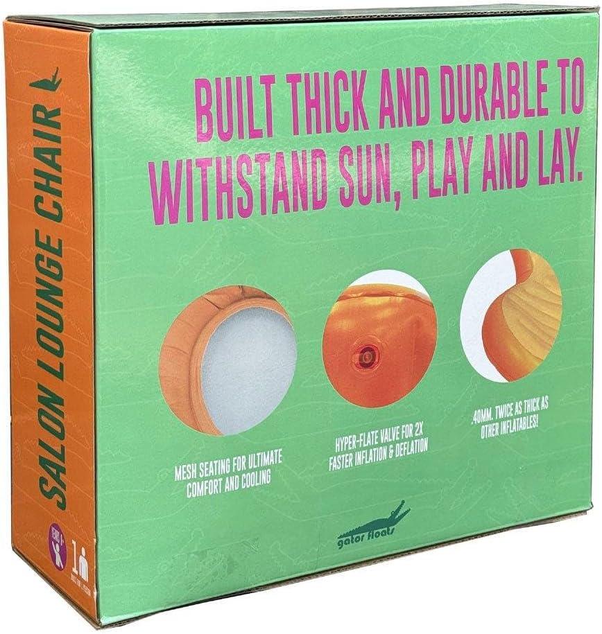 Gator Floats Salon Lounge Chair features mesh seating for ultimate comfort and cooling during the warm summer days. You'll be able to inflate and deflate the pool float 2X faster with the hyper-flate valve.Gator Floats Salon Lounge Chair is built thick and durable to withstand sun, play and lay!