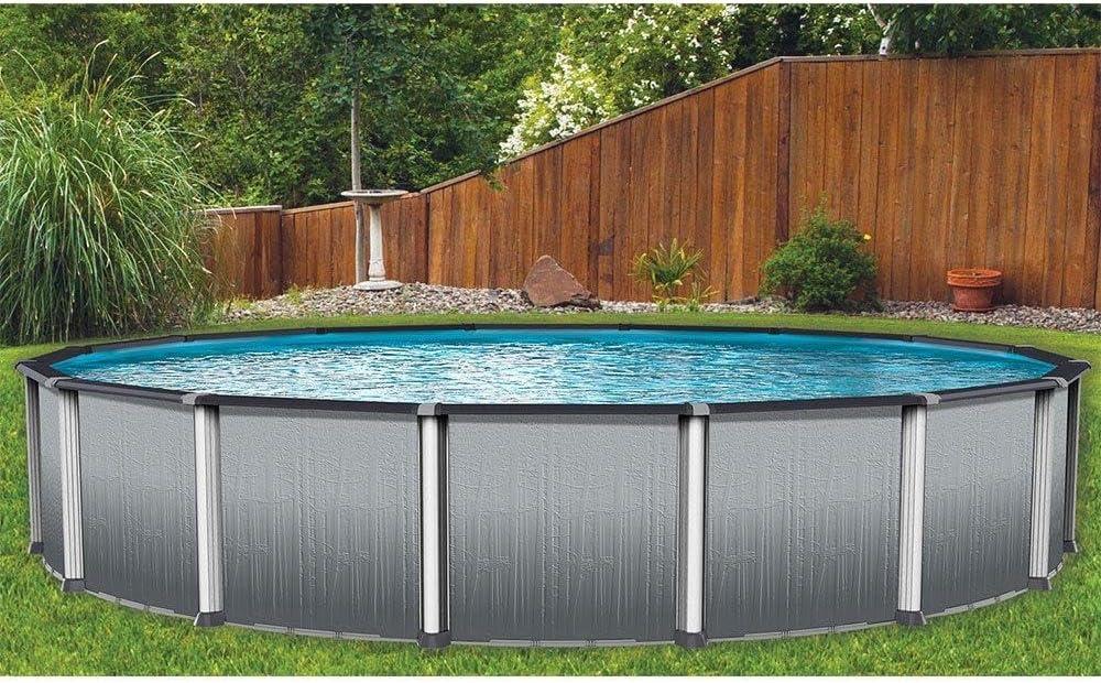 Enhance Your Backyard: Elevate your outdoor space with our 27' Round Above-Ground Swimming Pool, featuring elegant 52-inch walls with a subtle tree silhouette in refined gray tones.