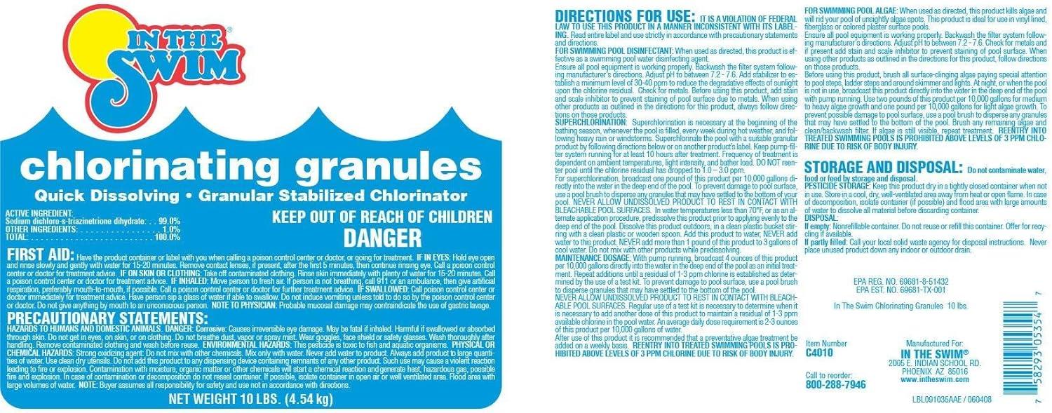 In The Swim Sodium Dichlor Chlorine Shock Granules for Sanitizing Swimming Pools – Fast Dissolving, pH Balanced Sanitizer – 56% Available Chlorine, 99% Sodium-Dichlor – 40 Pound(40 Pound)